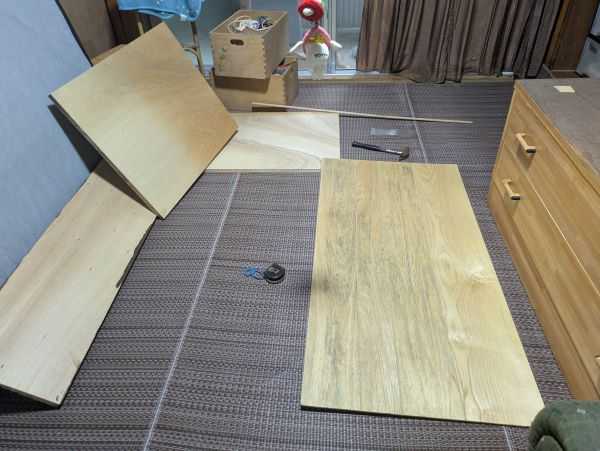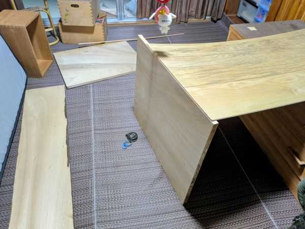 タンスを少し手直しできるかなと思ったんです。雨で外では作業ができませんので、のこぎり仕事は最小限にし、部屋に材料を持ち込んで、タンスに合わせて組み立てしていくことにしました。