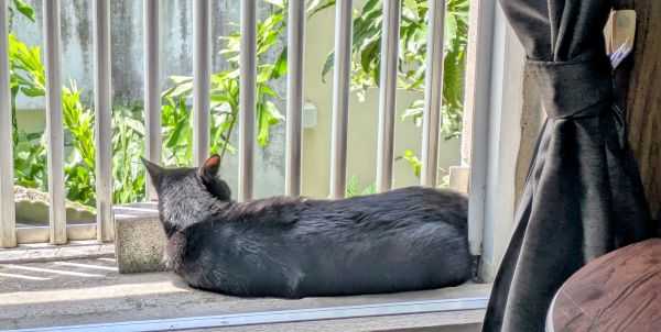 和室は買い置きしていたブラウン系のゴザで猫防止、雰囲気は暗くなりましたが、今年はこれで乗り切ります。窓の小さな出窓はいつものチビチビのくつろぎ場所、今日もしっかりくつろいでいますウィンク