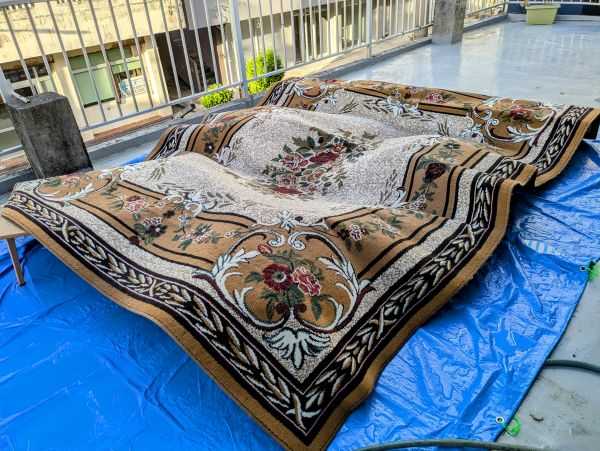 家の中では洗えないので、ベランダに引っ張り出して洗ってしまいました。ベランダが広くて良かった~大笑い