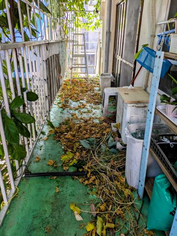 お昼過ぎ、家より外の方が涼しそうだったので、外廊下のパッション整理を始めました。今日も枯れ葉や枯れ枝が3袋分処理できました。