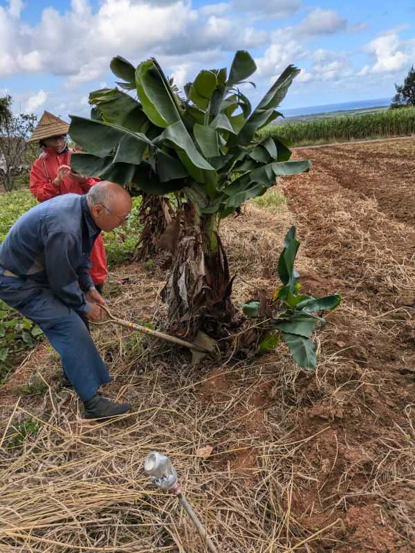 こちらのバナナは、実もしっかりついて、少しだけ畑の隅に残っていました。ミニバナナの畑として作った事は聞いていましたが、農園主が亡くなり、いつの間にかバナナも消え消えになって、畑を借り受けた方はバナナの名前を知りませんでした。