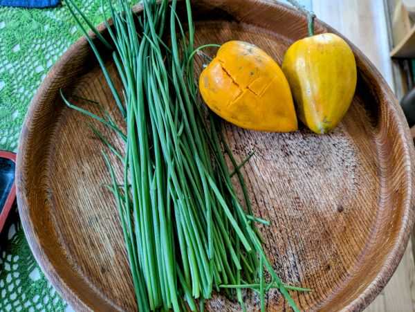 大急ぎで小ネギをカット、出来上がったお味噌汁の中へ散らし、採りたて小ネギの香りを味わいます。