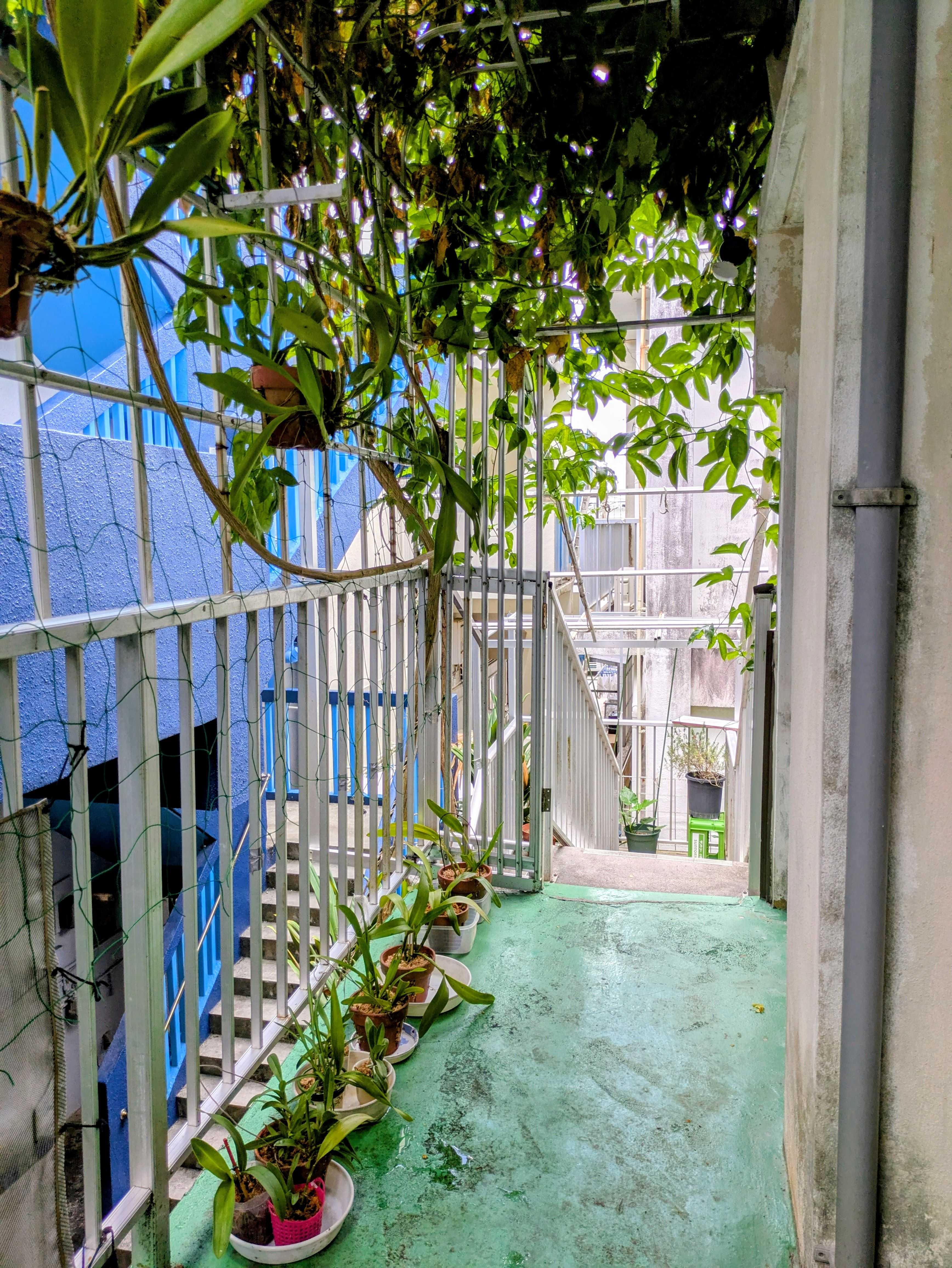 2階に持ってきたランは、植え替えがすべて終わっていましたが、パッションを刈り取った外廊下で、わずか1~2時間しか刺さない日光に、日焼けを起こしてしまいました。今日はパッションが繁茂している階段近くに、一時的に避難です。
