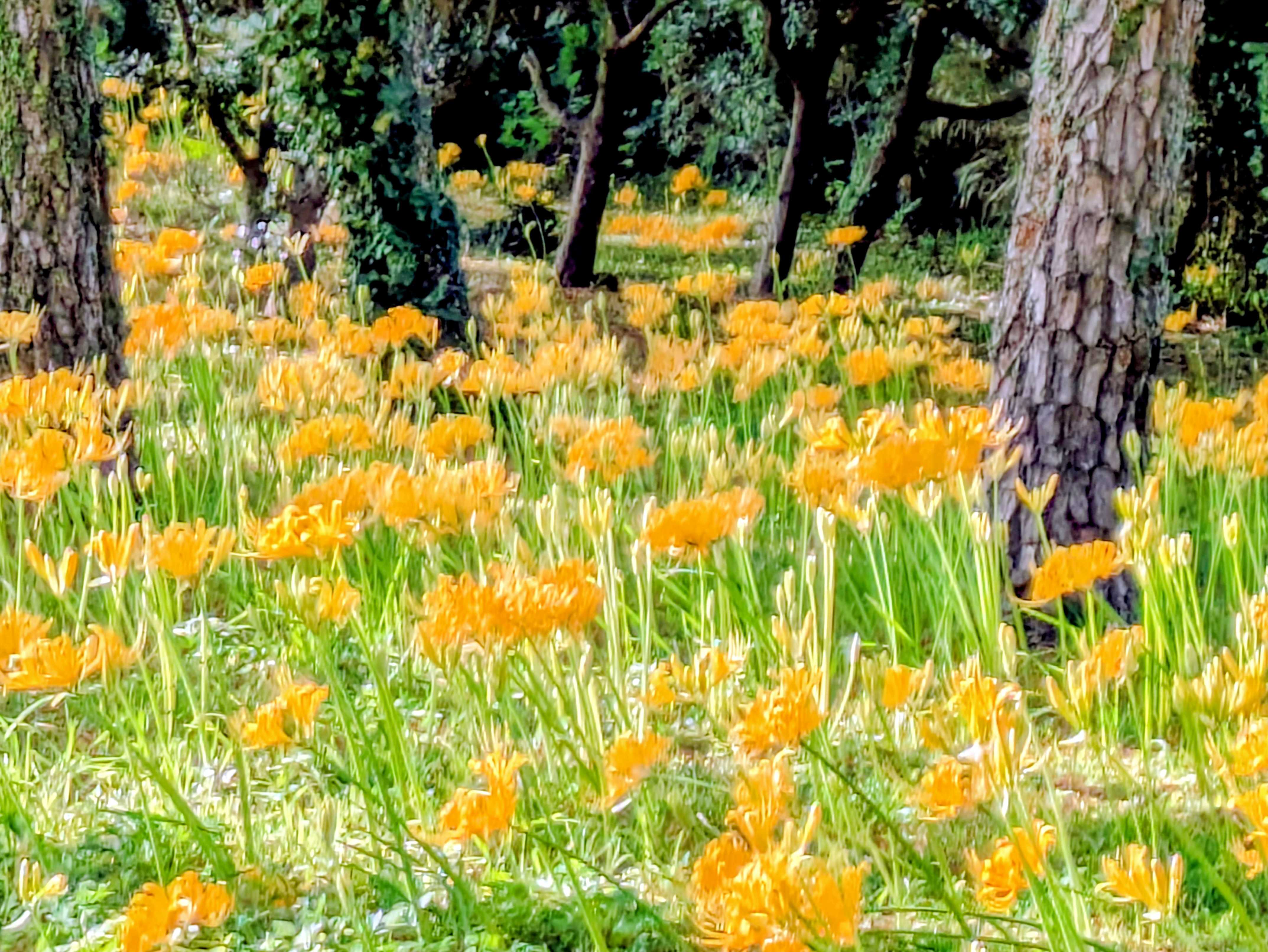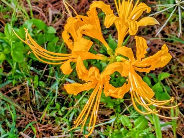 ヒガンバナ科の黄色で、いつの頃からか久米島で多く見られるようになりました。子供の頃は意識していない花でしたが、だるま山公園や空港通りに植えられるようになった近年、島の花として認知度が高くなってきました。