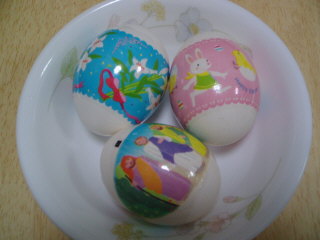 昨日、長女がイースター記念品エッグアートを学校から頂きました何だこれ? セロファンに絵柄が書いてあります。ゆで卵を作って、そのセロファンを殻のままのゆで卵に巻いて熱湯に漬けるんだって。説明書きのとおり、やってみましょイースター=復活祭ぐらいしか知らないです「チャペルニュース」を読むと・・・イースターエッグとは、ちょうど、ひよこが卵の殻を破って出てくる姿が、キリストが死という殻を破って蘇ったことを象徴していると考えられたので、イースターのお祝いに卵が使われるようになったそうです。外国では、家の内外に隠しておいて、子どもも大人も皆で探したり、卵ころがしをしたり楽しむそうです。芸術的な、すごい絵付けのもあるとか・・・我が家のは、こんな感じに仕上がりました。可愛いって娘達は、喜びました。それと、そのイースターエッグは、うさぎが配り歩くと言う伝説も生まれたたそうです。と、長女が「うちに、そのうさぎが居るよ」と言ったのが、もう10年ぐらい前に買ったうさぎの置き物です。ホント~カラフルな卵を持ってるぅリビングに長年飾っているうさぎが、イースターのうさぎだなんて・・・キリスト教のことは無知だけど、ちょっと勉強になった私と次女でした