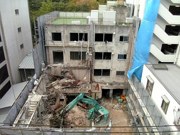 先月、ビル建替えの為、裏のビルに引越ししました解体が始まり、外は騒がしいし、揺れます今日は、6階にあがってみて、上から撮ってみた。だいぶ、壊されてます。席に戻って仕事をしてると、社長が帰ってきて「6階上がってきて、見てみぃ~!9割壊れてんでぇ!」って言う。私は、もう見てきたもーん写真まで撮ってきたしぃ手前の左側がほとんど壊されてます。奥は、まだやけどねぇ。