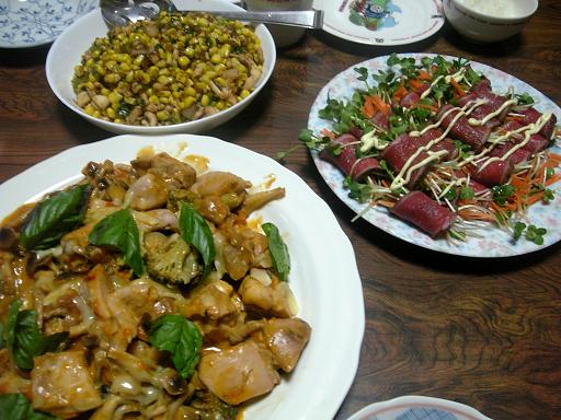 今日は、3品作りました。チキントマトソース煮チーズかけ、ローストビーフの野菜巻き、イカととうもろこしのカレー炒めです。とテレビ番組を見て作ったのどれも簡単でしたぁ。カレー炒めは、師匠の(←勝手に呼んでるの)上沼恵美子さんのおしゃべりクッキングでやってたすごいよねぇ、えみちゃん。私は昔から(短大の頃?それよりも前?)ビデオに録ってレシピ帳をこしらえてたの。それっくらい好きやねん、えみちゃんも、この番組も