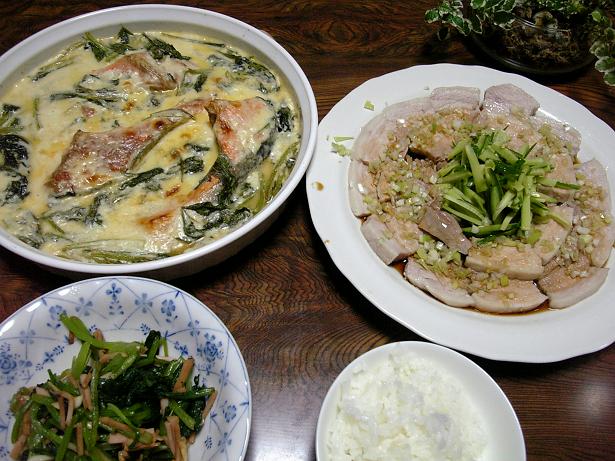 晩ごはん作ってん鮭と小松菜のグラタンと、韓国風ゆで豚、イタリアンお浸しです。ほうれん草なかったので、小松菜でグラタンにしました韓国風ゆで豚は、豚のブロックをにんにく、ねぎ、酒と一緒にゆでて、スライスしてます。しょうゆ、酢、砂糖、ごま油を混ぜたたれをかけるだけという簡単さですっゆでてるので、ヘルシーですしねぇお浸しもめっちゃ簡単ですし、すぐできましたぁ