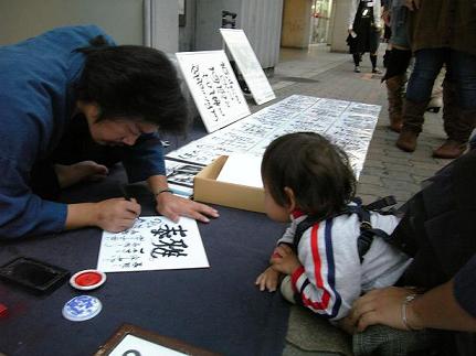 買い物帰りに歩いてると、バルーンアートや、絵を売ってる人たちがいた。その中で、興味あったのが、筆ですらすらーって書いてる人がいた。大五郎さんというらしい。全国各地を回ってるんやて。こういう字を私も書けたらなぁ~って思うねんなぁ。年賀状とかにいいでしょ学生さんっぽい女の子らが書いてもらってた。自分のことを書いてくれるねん。お金いくらなんやろぉって見ると、できあがりを見て決めてください。 と色紙に書いてあった。こういうのん、一番困るねぇ100円でもいいの1000円くらいあげるのが普通いっそのこと値段書いててくれた方がいいなぁ・・・この子らがいくら払うか見とこ。 1000円払ってた。そ、そうやんねぇ私も書いてもらった。なんて、書いてくれるんだろぉ?「私の目を3秒間見てください」と言われます。これで、書くことを決めるみたい。知らない人と見詰め合うなんて、恥ずかしいねぇ1000円払いました友達は、息子のを書いてもらってた。500円払ってた。あらら。真剣に見てるみたいでしょぉ?こんな感じです♪才能があれば、こうやって、できるんやねぇ。私が見てた5分くらいの間で、3500円もらってたんやもん私のやつは、こんなん。久美子は、下の字の方が好きだな