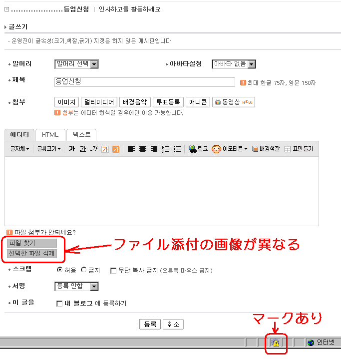 ファイルを添付しなくても、ファイル添付用の画像が左の画像と異なる場合、書き込みが登録できません。