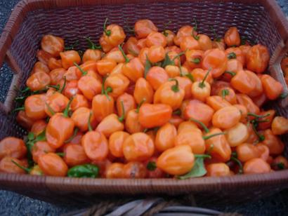 収穫したばかりのハバネロオレンジです 赤より幾分か辛いようです ハバネロは他の唐辛子に比べ生の状態では腐りやすいのが欠点です 乾燥もけっこう難しい!