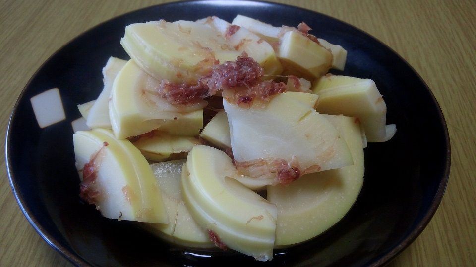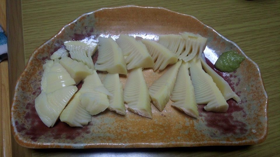 頂き物のタケノコを茹でて柔らかい穂先のみ刺身に。