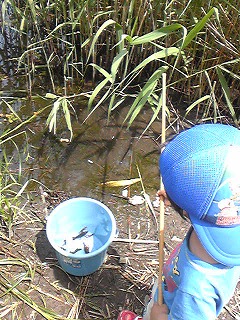 先週の土曜日珍しくオレお休み。子供が「ザリガニ釣りたい」って騒ぐもんだから、ネットで調べたけど芳しい情報無し。多分ここならOKでしょうって所を見当つけて行きました。場所は市内の池。駐車場はあるし公園もあるので、もしも釣れなくてもOK。行ってみたら駐車場はガラガラ。5分ぐらい歩いて池に到着。子供たちが何か釣ってる。近寄ってみたら「ブルーギル」をたくさん釣っていました。段々の堤防のところでアメリカザリガニ発見!!。でも深すぎて無理。ちなみに道具は、家にあった1.2mぐらいの竹の棒にナイロンの糸を竿と同じぐらいにつけて、糸の先端にコンビニで買ったお酒のおつまみ「あたりめ」を1個くくりつけているというシンプルな物。池の反対側に歩いていたら、葦の間に少し間隔があるところを見つけた。近寄ってみたら5cmぐらいのザリガニがいる。ラッキー早速、こどもに竿を握らせ「あたりめ」の付いた糸を持ってザリガニの近くに着水させたらいきなり パク 食った。竿を上げさせたら、5cmほどのザリガニが釣れました。こども大喜び。何だかんだで、20匹ぐらい釣りました。オレは釣らなかったけど、嫁が面白がって釣っていた(^_^;) けっこう 面白いよ。 タイトルは、一穂という人の曲。FMで流れていて、気に入りました。面白い曲です。