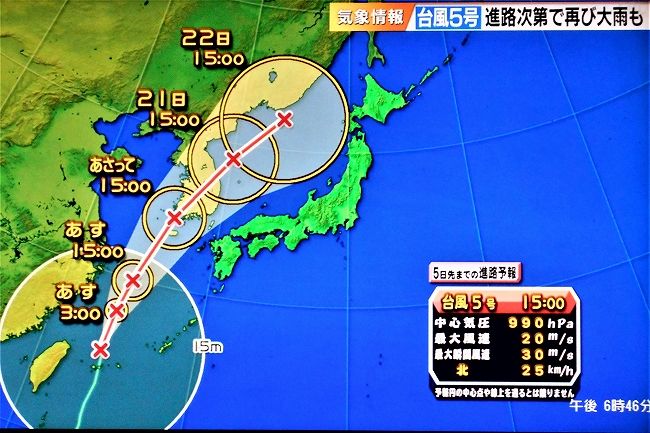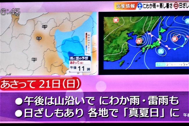今年の気候はおかしくサクランボ・ぽぽ-梨や桃類は霜に会い1っも食べられず実のものはサルナシだけは元気に育っている又キウリは育ちも良く普段の年の倍の収穫だ気象予報は7月に入り当たった事がない 気象協会予報士(気象庁の示した物から選ぶ)土日の予報台風の影響は