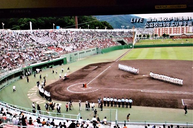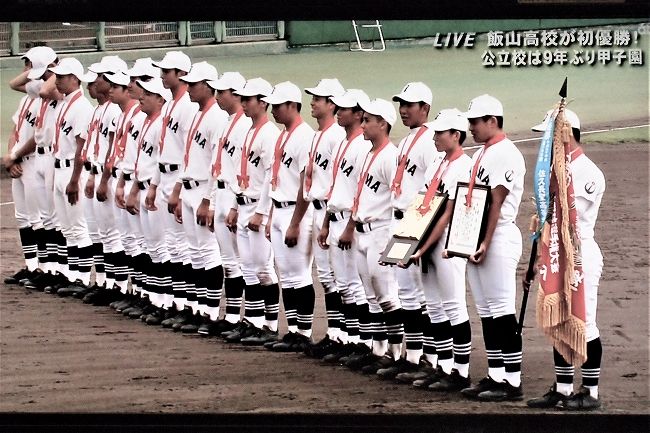昨日昨年の準優勝の上田西高をやぶり今日の決勝戦は伊那弥生ケ丘高校を延長10回で5A-4 で破りついに全国大会の甲子園出場となり創立以来初めての快挙なった 試合終了表彰式の整列表彰を受け優勝旗等を受け取り後 おめでとうございます 甲子園でも頑張ってください