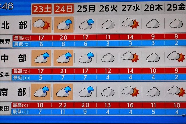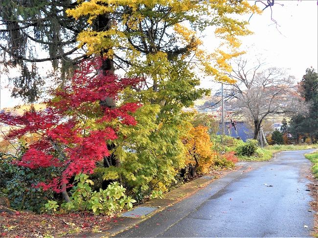 周りの山々が前年より4日ばかり早く白くなり急に寒くなり今朝は-2.2℃まで下がった 明日からちょっと温かくなるようだ 地区内の紅葉も後わずかか気象予報