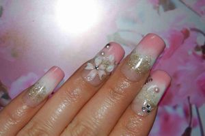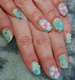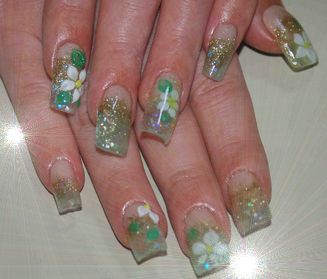 今日のお客様のネイルは「若葉の頃」新緑といったイメージで作ってみました。はじめに、クリアラメ、薄くグリーンを入れ、ゴールドをいれて白花に葉を乗せて、クリアパウダーでかぶせました。画像は、こちらです↓出来上がって、喜んでもらえるのは、いつも嬉しいです。えーと、最近は仕事をしても、画像を撮るのを忘れてしまったりちょっと、ボーっとしちゃってるSHIROCHIIですが今日は、張り切って頑張りました。頑張ったね、って思ってくれた方は、応援よろしくお願いします。さて、今日は、何故こんな時間の更新かと言いますと少し前まで、仕事をしていたんです。何だか、やる事がいっぱいありまして、家の事、仕事の物の整理、(新しい商品の整理)だけどね、昼間遊んでいたから悪いんだと反省。最近は、PCが大好きになっちゃって間違いなく、依存症といったところでしょうか。んでもって、何だかPCで、こんな物まで作ってみました。とてもこの世の物とは思えません。変な代物です・・・貞子??いやぁ~怖い。こちらです。。。←気持ち悪い。なんで、こんなん、作ったんだろ・・・・。激しく、馬鹿です。こんな事してる暇があったら、仕事しろ・・ってコヤツに耳元で、囁かれそうです・・・。全く・・・。話は変わりますが、明日は旦那様がお休みです。明日こそは、出掛けたいと思っているんですけど起きれるんでしょうか・・・・私。何処に行くかは、まだ予定も経ててませんがちょっくら、行ってこよう。では、おやすみなさい。