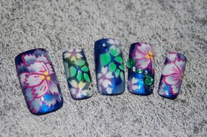 今日のネイルは「藍白花」ちょっと、まだ時期的にはどうなのか???というネイルなんですがどちらかというと、浴衣調なんで・・・。画像は、こちらです。エアブラシで花を描いて、その後を、筆で描きました。 ランキングに参加しています。ぽちっと応援よろしくお願いします。ぺこり。さて、今日なんですが何故、こんな時間の、更新かと言いますと私、眠ってしまったんですよ。また、やってしまいましたーーーーー。連日の睡眠不足、明日からの子供たちの春休み。何だか、体に疲れが溜まっていたようです。昼間、やることやってお昼には、子供たちとご飯食べて、それから出掛けて夕方になって、帰ってきてから町内の仕事をして。その後は、ご飯を食べてぐっすり・・・・。はい。今まで眠ってました。目を開けて、びっくり!!!!!何ーーー!!1:30~??目をゴシゴシ擦って・・・( ・д⊂ヽ゛・・・恐る、恐る・・もう一度確認。←諦め悪いです。やっぱり、時間、間違ってないーーーー。は~~~やっちまったーーーー。確かに夕方帰ってきたときに、すでに眠かった。子供たちも、眠そうにしていた。今も、子供たちはぐっすり夢の中・・・。起きたら、子供も寝てたが、旦那は帰ってきていて「あんた、よく寝てたよ~」しかも、イビキもかいていたらしい。まっいいか。←諦めは早い。実は、話変わりますけど私、今年は町内の組長だったんですね。何やら、初めてやるので、ほんと分からないことばかりでとっても、困りました。それも、ようやく、もうすぐ終わる。一年、長かったーーー。←相当嫌だったと判明。だけど、最後に引継ぎの飲み会があるんだよね。そちらの、店の予約もあるし・・・。まだ少しだけど、仕事も残っている。人付き合いは、大好きだけど、永遠と聞かされる苦情・・・。これには、さすがに参ったし。ご近所でも、折り合いの悪い家というものはあるらしいっす。でも、やっとで開放されるんで良かったよ~~。明日から、4月の頭までは、子供たち家にいるんですね・・・。仕事もおちおちしてられないです。どうしても、スカルプとかになれば、最初から最後までやると3時間はかかりますんで。←仕事のろいです。子供は、待てないようです。子供好きな方が、お客様だと良いんですけどね。また、子供とは、知らない人にでも、気安く話しかけてしまうんで、困ります。どうなることやら。。。でも、頑張ってみますよ・・・ヨロヨロ。