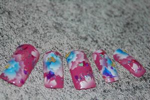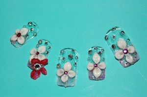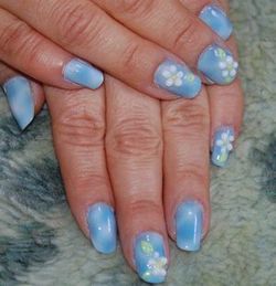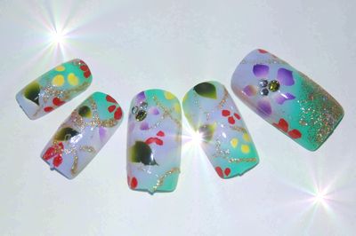 今日のお客様のネイルは「SKYFLOWER」爽やかな空に舞う花が、テーマです。画像はこちらです。↓お客様も、「可愛らしい」と満足されて帰られたのは良いんですけど。私、またやっちゃいました。エアポリッシュも付いたまま、しかもオイルも塗り忘れて撮影しています。話に夢中で、すっかりもう一枚後から撮るということを、忘れました。 ええっと、今日なんですが小学校が、始業式でして、何とも中途半端な時間に学校に出かけていきました。昼の12時半に学校集合です。早めのお昼を食べて、私は仕事だったため、家事を済ませ仕事をし小僧が帰ってくるのを待っていました。だけど、待っても、待っても彼は帰って来ない。「何をしているんだーーーうちの小僧は」やがて、4時過ぎになり、ようやく帰ってきた。小僧「ただいま~~」私「何時だと思ってるんだ、他の子達はとっくに帰ってきてたぞ!!何で連絡もしないんだ」小僧「だって、終わってすぐに帰ってきたもん」私「嘘つくな、言い訳無用、遊んでくるなら連絡ぐらいしなさい(怒)」と言ったら、彼は泣き出した。。。小僧「本当だもん、うちのクラスは遅かったんだよ」ん!?待てよ・・・確か、今日はクラス替えが・・・。そうかー、確かに近所の小僧さん達とはクラスが別れたと子供が言ってたなぁ。なので、小僧に「ごめん。お母さん悪かった・・今日はクラス替えだったね」と言うと小僧「もう嫌だ、お母さんの馬鹿、許さない」←頑固。なだめすかしたが、許さないと言っているので、最後は逆切れ・・・。←大人気ない。母「そんなに、嫌ならもうええわ」彼は、シブシブ許したらしい。でも、可哀想なこと言っちゃったよな。。。そうだよ、あいつは、素直な良い子供なのに。←親バカ。反省しました。それから夜になって、子供たちとお風呂に入ったんだけど小僧は、一生懸命妹の面倒を見る。先に小僧が風呂を出て、娘に「20まで数えてね」と言い私が顔を洗っていると・・・「1.2.3・・・15・16・18・13」娘・・・17抜けてる、しかも又13から数えなおしてる・・・。あなた、かなり間違えちゃってますよ。その後、小僧が娘の体を拭いてくれ着替えも手伝ってあげてた。←良い奴だ。その時の娘ときたら・・・「なんかね~わたち、年寄りになっちゃったの・・・」←おいっ!!Σ(・∀・`;) 娘!!「だってね、あたちの手は、しわくちゃになっちゃったのよ」そりゃー当たり前だ。だって、あんた、20数えりゃいいとこを、50位は数えてたじぇ。ああ・・・気の毒に・・・。さて、私は今から、小僧の持ち物全てにクラスの書き換えをしなければならない。↑嫌だーーー。しかも、今日になって、突然!!明日はお弁当持参でのプリントが学校から来た。ああーーー地獄だーーー。ネイルランキング←クリック♪ネイルブログランキング←クリック♪FC2ブログランキング←クリック♪ランキングに参加しています。ポチッと応援よろしくお願いします。ぺこり。