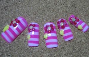 今日は、ショップ用の商品を作ってみました。画像はこちらです↓こちらが、FLOWERバージョン。お花4個、葉5個、クリアストーン(マシンカット)大小16個スワロフスキーオーロラ2個ホワイトパール大小15個、ホログラムのセット。こちらが、ハートバージョン。ハートうすピンク2個、ハート3個、ハートホワイト1個クリアストーン(マシンカット)大小16個クリアストーン特大1個スワロフスキーオーロラ2個ピンクパール大小15個、ホログラムのセット。これだけあれば、なかなかのデザインの物が出来るであろうと思いましてセットで、販売する事にしました。これからも、色んなバージョン作っていこうと思っています。 さて、昨日言っていたデザインも出来上がりました。コメントを下さった皆様には、大変お世話になりました。「ありがとうございました」今日は、日頃の疲れを癒そうと、お風呂屋さんに行って参りました。子供たちと、私と、姉で、車2台のお出掛けです。国道を走って行ったのですが、私の姉、速いです。追いつけませんから・・・何せ、私の車は家計に優しい車。ハッキリ言って、無理です。カメさんです。私は、娘を乗せ、姉は小僧を乗せて行ったのですが私の車では、「ポップスター」(平井堅様でございますね)が流れていました。何を思ったか、信号待ちの所で、娘が・・・思いっきり窓開けて「お兄ちゃ~~ん、ぽぷすたーやってるよ~!ぽぷすた」兄「は~?ほぶすたって何ぃ~~?」いえいえ、あなたたち、どっちも間違ってますから・・・。きっと、平井堅も怒っちゃいますから・・・(さっきまでは様だったのに、呼び捨てだーー)んで、風呂屋に着いたんですが、今日は人が少なかったです。まさに、貸切に近い状態でした。三時間近く居たんですが、出たら、お肌ツルッツルですよ。やっぱり、風呂屋はいいですね~~~。気分転換には、最高です。あっ!!勿論、露天風呂も入りましたよ。。。楽しかったです。ネイルランキング←クリック♪ネイルブログランキング←クリック♪ランキングに参加しています。ポチッと応援よろしくお願いします。ぺこり。