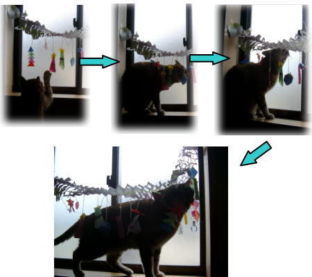 今朝は、主人は仕事で 6時出発・・・(お疲れ様です。。。)猫のハナコも朝食の後は、お昼寝(朝寝)タイム。この間、約2時間、七夕飾りを仕上げました。(他にしなければならないことがあるんだけどなぁ・・・ でも 今年の7月7日は今日しかない)と・・・そして、窓に飾ってまもなく、黒い影が、やってきました・・・黒い影は、やっぱり・・・「なんだか、変なものがあるなぁ~。」「とりあえず、やつっけてしまおう!」すっかり、いたずら猫の目になっています「ハナちゃん、これは食べられないよ。 そんなことをしたら、お空のお星様が願い事を叶えてくれないよ。」「お空のお☆様???」ハナコの願い事は、何かなぁ・・・