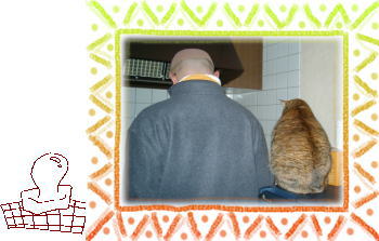 「餅を焼くのは、俺に任しとけ!」 と車屋の主人・・・「大丈夫かニャ~」 と猫のハナコ・・・1人と1匹が、お餅焼をしている後姿です。とっても優しい、私の大好きな家族たちです。