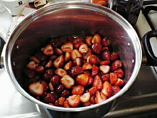 とりあえず、イチゴに砂糖を絡めて、一晩おいておきます。