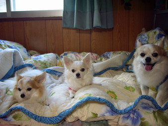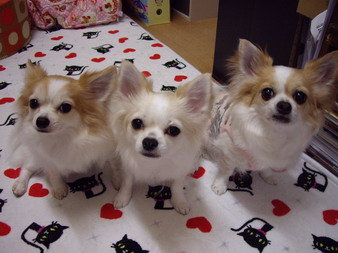 大変ご無沙汰しております。最近は携帯のゲームにはまり、すっかりブログを忘れています。画像も全然UPしていないし・・・まだまだ携帯の使用です。スマートフォンに魅力を感じていない??クルたん一家は相変わらず。元気に過ごしております。特に何も無く、平和な日々が過ぎています。いい事だ・・・クルたんのヒートが始まるとモコの食欲がなくなり、少し痩せ2か月後には元通りになり、クルたんが想像妊娠する。そんな繰り返しが続き、一家は何事も無かった様に戻る。10か月ごとの行事???です。あみはクルたんが気に入らないのか、時々喧嘩を売ってますが、クルたんが「全然関係ないも~~~~ん」って感じの態度で何事も無かった様に、しかし、私に助けを求めてくるのが日常茶飯事・・・かと思えば、最近寒くなったので、3人で団子の様に寄り添って寝ている姿は「幸せの盛り合わせ」状態です。そんな3人が愛おしくて可愛くて・・・・幸せクルたん一家でした。笑
