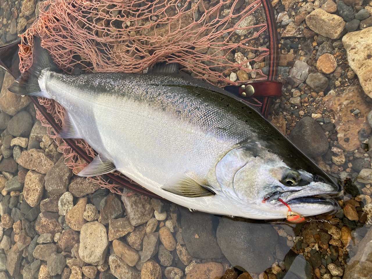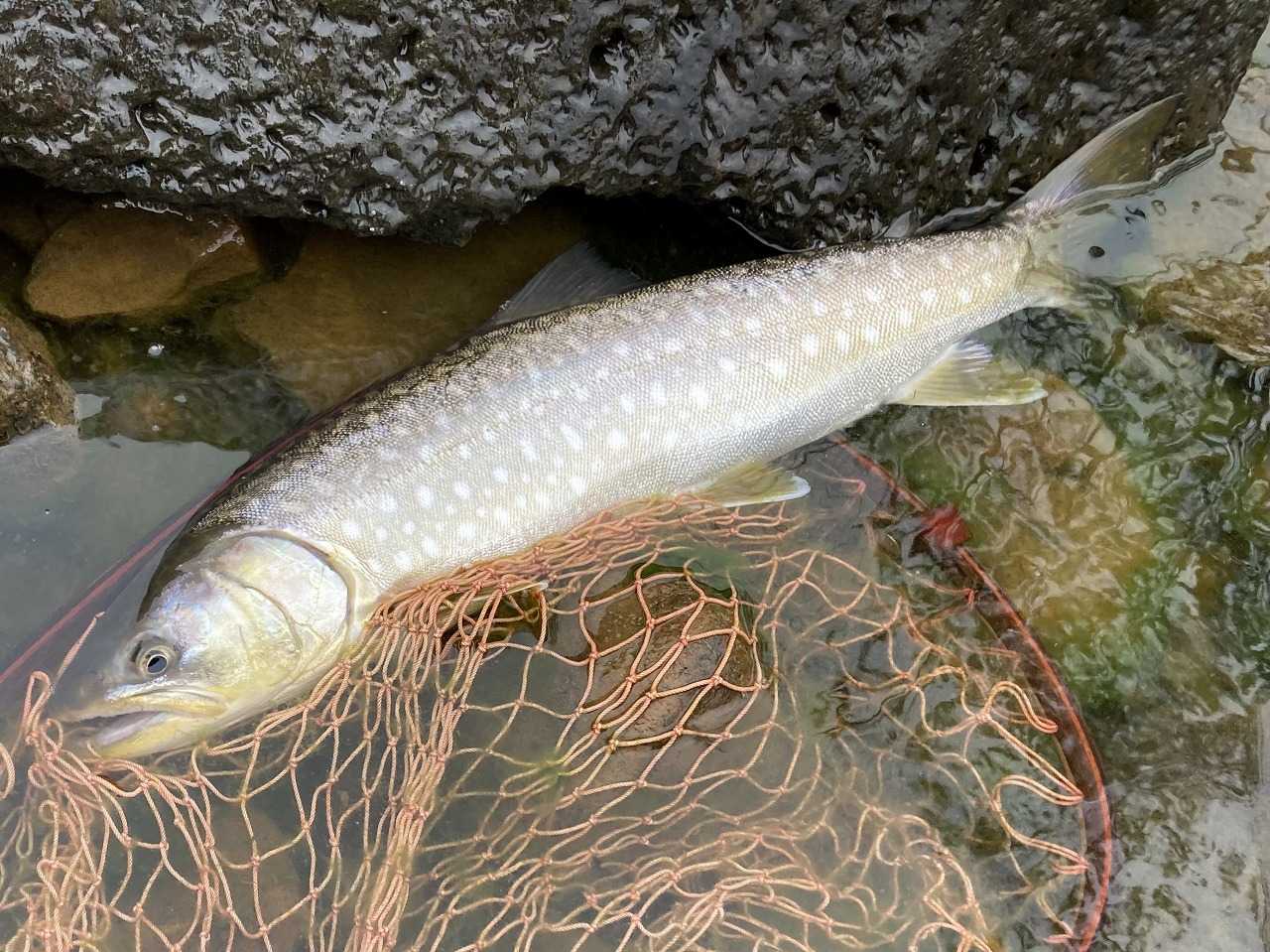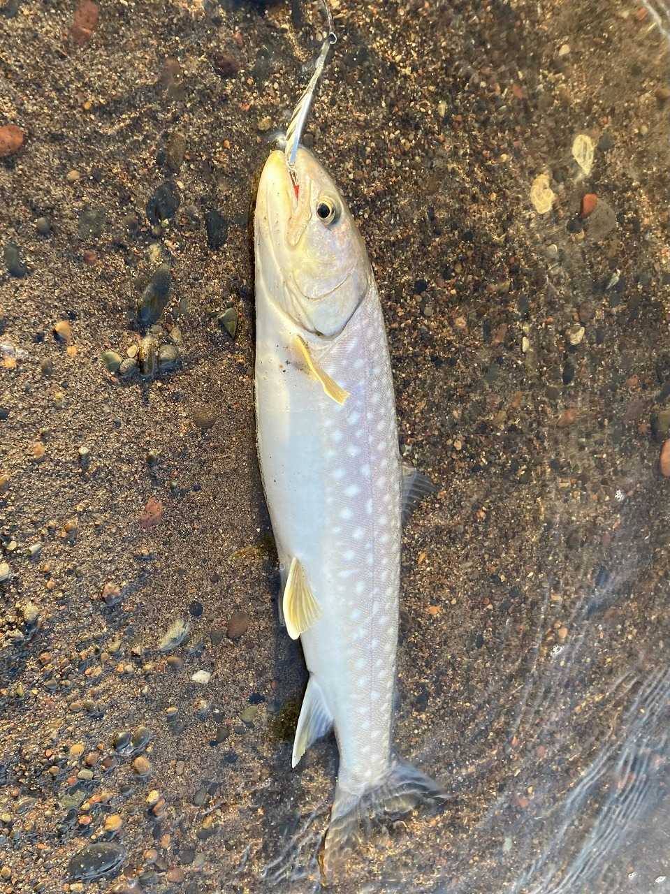 本日も明るくなってから家を出ました!鹿さんが怖いので(笑)予定していたポイントに到着すると風が当たりザップンザップン!連続サクラマス釣果記録がかかってましたが...私は最近、この向い風に挑む勇気がありません(笑)ということでポイント移動♪途中、見たことあるランクルが信号で停まっていたが素通りしたら電話がなった!(笑)着いたポイントにはフライマンが一人ここでイイっかってことで、キャストすること2投目ウグイと違うライズが!そこかってキャストォー!グラマーをクルクル♪クルクル♪でグイっ!と止まった!近くに寄せてから、なかなかの抵抗を見せたのは50ジャストながらコンディション抜群のアメマス♪ヒットルアーはモーダ グラマー 14g MG11最近はナナマルだの!ハチマルだの!とデカアメの話しばかりなので、この手のサイズは写真も撮らずリリースしてましたが...それだと!ブログに乗せる写真がない(笑)雨も降り、横風も強くなり寒っ!!ってことで風裏に移動しましたがやっぱ釣れないやっ!!(笑)