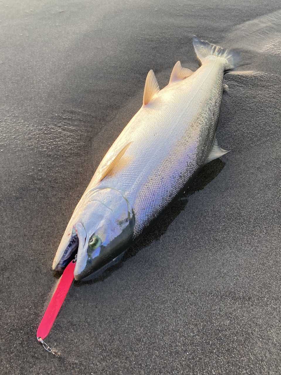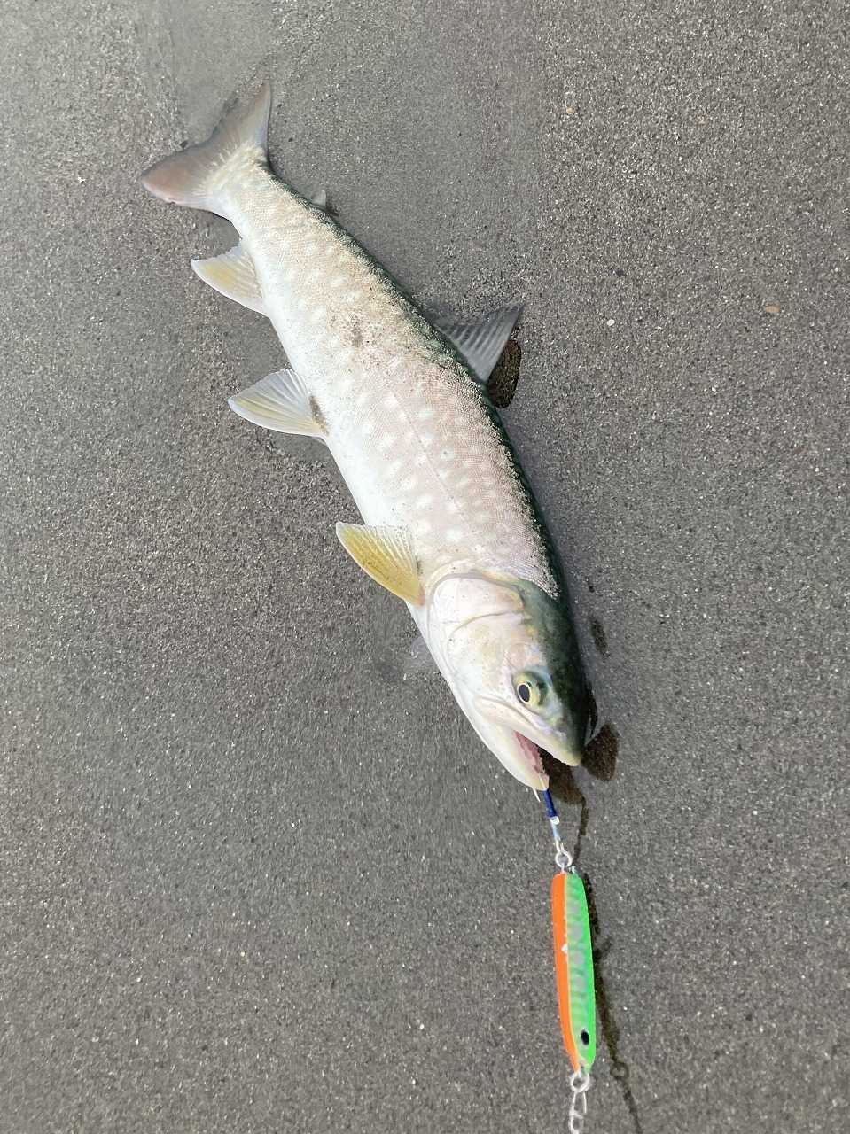 実は本日で4日目の釣行でした...例年サクラマスの開幕が早いサーフは...密です!!(笑)ホント、ここ数年でサクラマスアングラーが増えたのか凄い人ですね!!数年前までは、ほとんど人がいなかったんですけどね~ということで、人気のないサーフを散歩してましたしかし!ゴミと濁りに悩まされ...本日も朝着くと車が1台降りて着替えていると「あっきさん!」って呼ばれ振り返るとあれっ!十勝からいらしたんですか!近況を報告し先にサーフへゴミのないところまで歩き、サクラ狙いで表層をクルクル♪何もない...アメさんは?と、ちょと沈めてクル♪クル♪ずぅ~ん!?ぐわぁん!ぐわぁん!とヘッドシェイク♪シェイク♪まだ細いですが初物です♪(笑)さぁ~いよいよ海のトラウトフィッシング開幕ですよ~♪そして、プロビア26g・31gにニューカラーです♪ピンク&グロー&裏ピンクいかにもサクラが好きそうな色です!使ってみて下さい♪