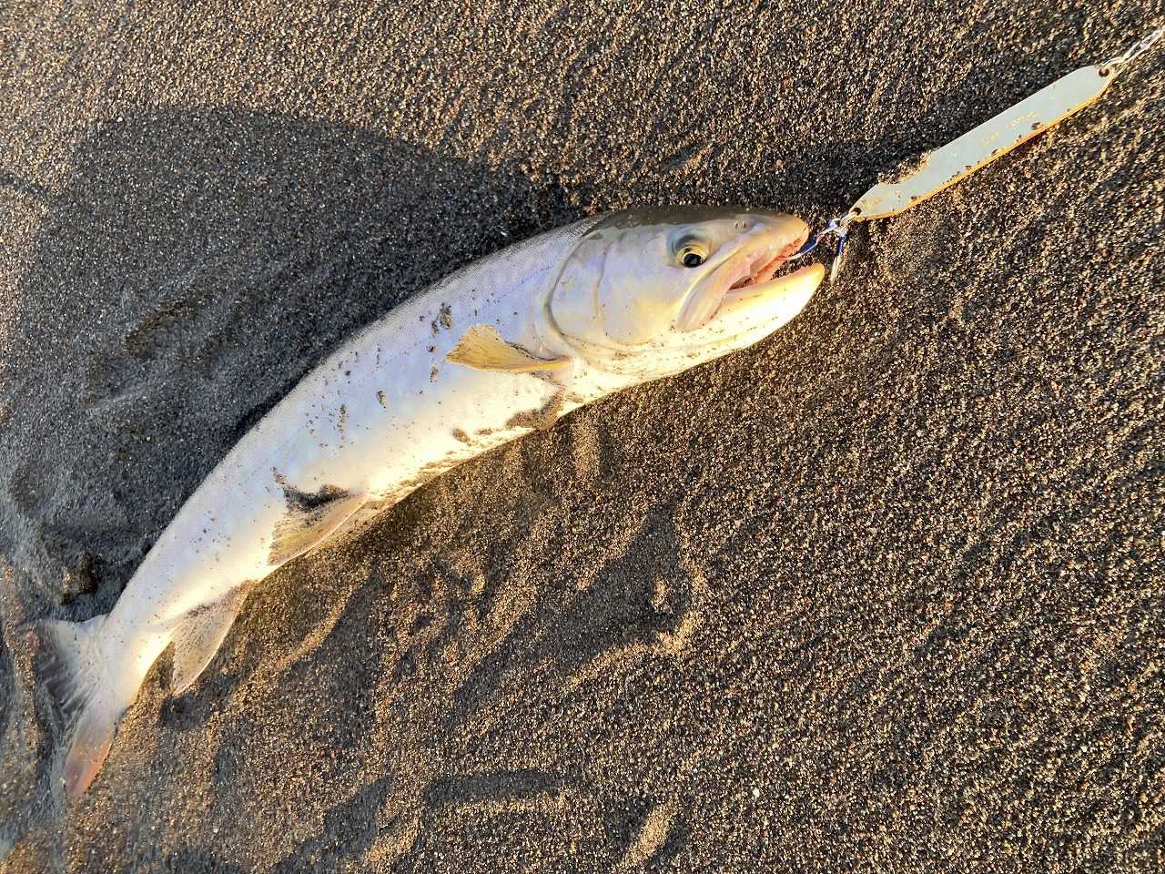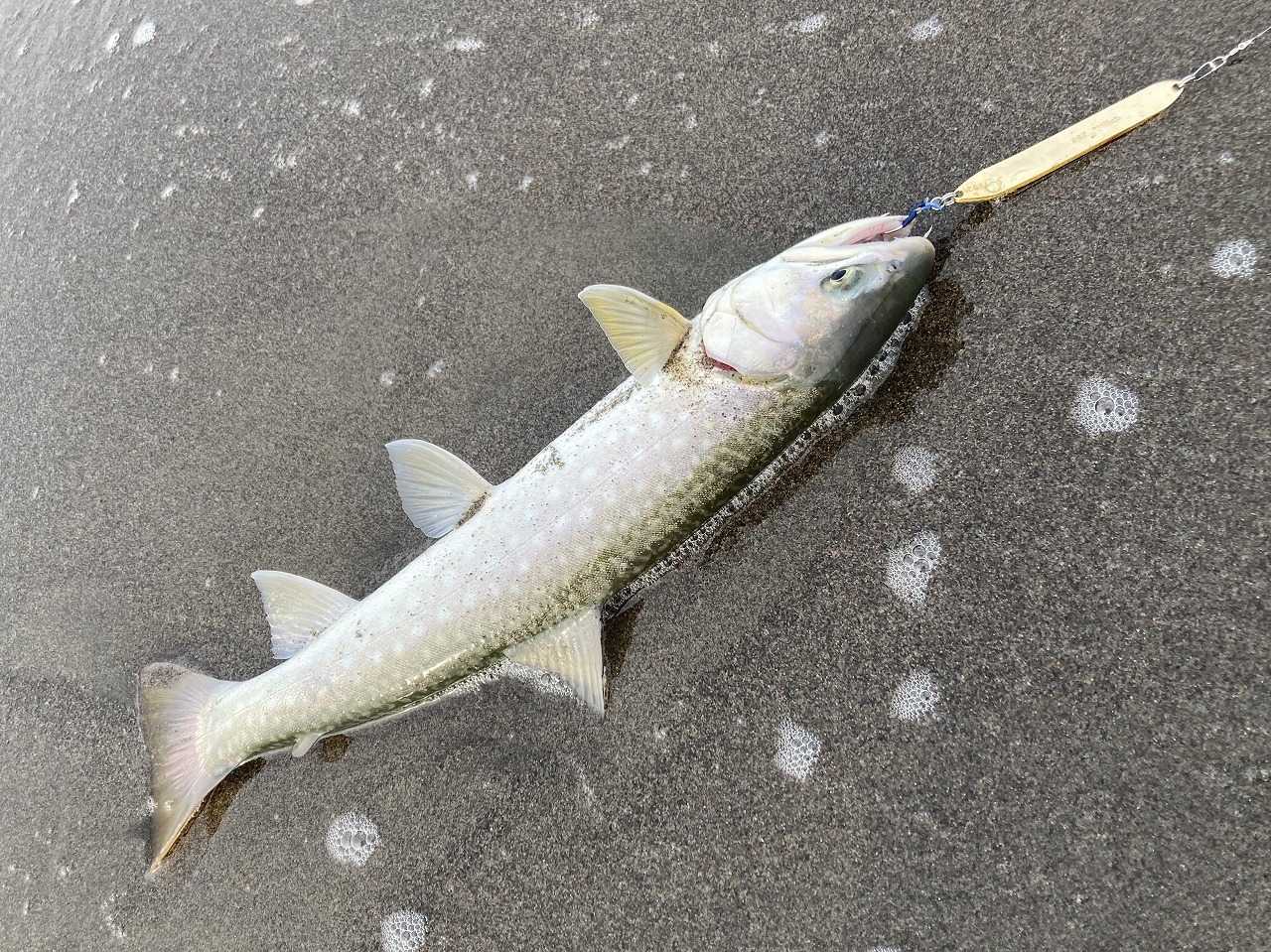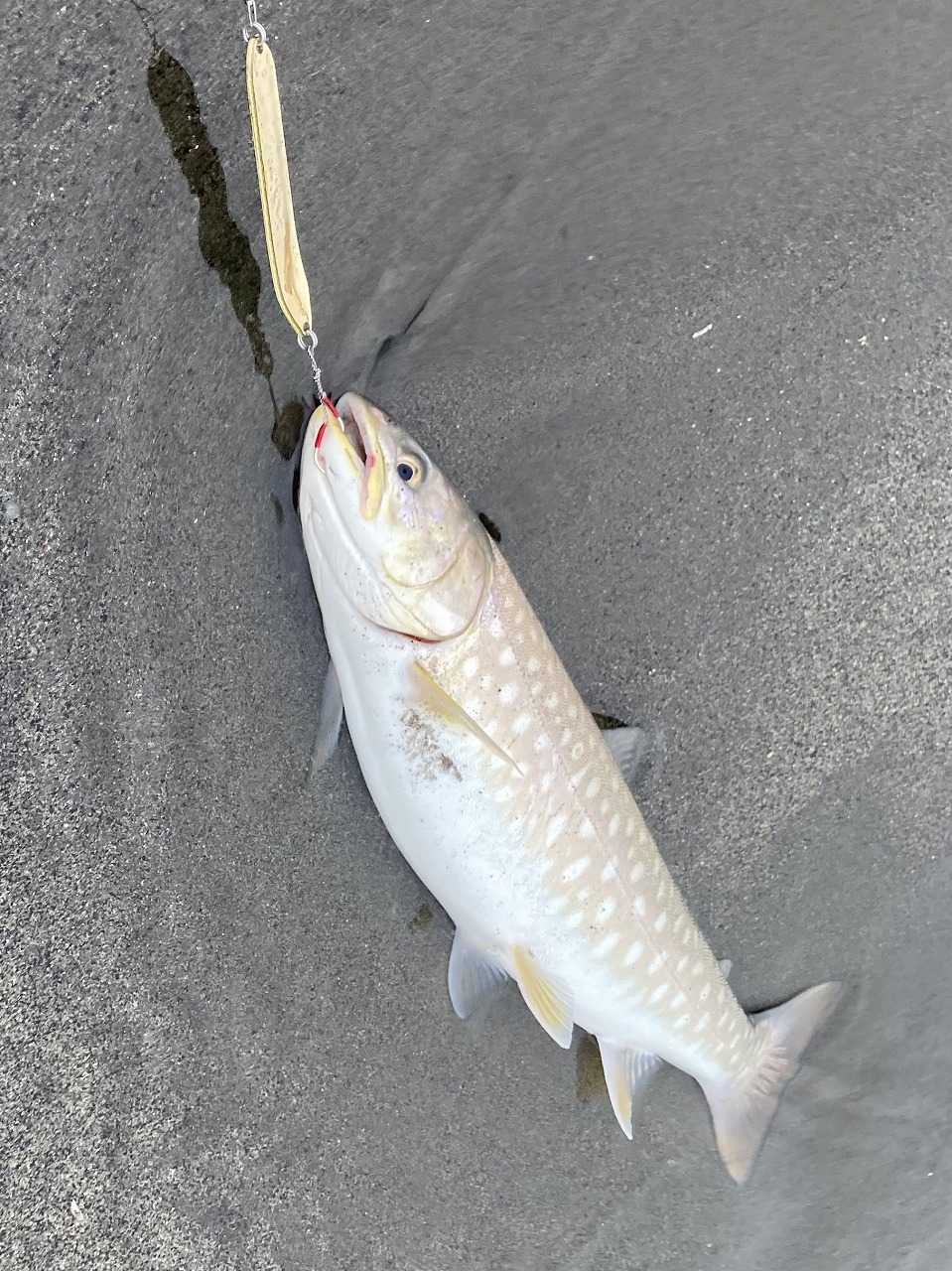 本日のサーフ・・・の前に6月11日(金)6時ちょっと前に時合いがきてプロビア26gで、このサイズを5本連発!ちょっと間をおいてリーズに替えたところでやっと海アメシーズンが始まった!と思ったが...月曜日から金曜日まではウグイ...チビアメ...しか釣れない...そして、本日昨日までは見られなかった謎の濁り...匂い...阿寒川の匂い!?臭っ!!(笑)濁りの薄い所まで歩きプロビア26gの巻き巻きで♪小さいけど...今までよりは遥かにデカい(笑)そして、立て続けにセブンイレブンのバームクーヘンを買って来てくれるオジサンが通りかかり「久しぶりにこのサイズ見たわ!」だって(笑)この後、一本を追加し終了~何やら西の方では、サクラが釣れているというのですが家から5分という誘惑には勝てないのです...(笑)