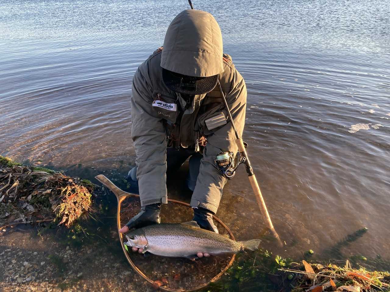本日は阿寒湖の解禁日♪でも...腰痛...テニス肘...痛いので、短時間勝負!風が吹き始めるちょっと前の7時に到着あっ!ここに来る途中は、川も湖も凄い車!!さすが解禁日!朝一で来ていたKちゃんに「どう?」「何もつれませ~ん」「やっぱり!(笑)」ちょっと歩いてランガンしてると良い風が吹き始めそろそろかなぁ~と思っていると至近距離でガツンッ!!「うぉ!やばっ!!」ドラグを緩め走らせ体制を立て直しがっ!まぁ~元気の良いこと!(笑)よっしゃー!っとネットインしたのは2022年 阿寒湖53㎝の初ニジです♪結構、波が出て来たので次の瞬間にはこんな状態(笑)これで写真撮影は終了~今年も良い感じでスタートが出来ました♪これからが楽しみですね~♪♪ロッド: ssyLABEL X1-90HHS-T2Zルアー: ssyLABEL moda glamour 18g MG09ライン: FAMELL RESIN SHELLER 8 0.8号リーダ: FAMELL SUPER HYBRIDO NYLON 12lb.