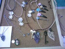 先日の日記のお直しになったカボション付きヘアピンを修理しました。パッチン留は「ぱっちん」する時にどうしてもモチーフを留めている個所に負担がかかってしまう上に、ツヤのある面同士の接着でさらに強度が弱くなってしまうので、その点を直したかったのですが。。※下の写真の右上のパッチン留が当初の品です。どうすればしっかりとモチーフを留める事が出来るのかで行き詰まってしまい(^_^;)そこで、いつもお世話になっているお友達の作家さんにご相談をさせて頂きました。急な相談にも親身に答えて下さりパッチン留の上に布や皮などの艶のない素材を挟み、その上にカボションを接着してはどうでしょうというアドバイスを頂き、早速実践してみる事にしました。↑写真上段の中央のカボションのみのものは、台座付のヘアピンに付けるのが強度もバッチリだろうという事でピンを変更。その他は、下にフェルトやレースリボン、ミニコサージュを付けて接着しました手前味噌ですが当初のシンプルなものよりも、手作り感が出た感じです。強度の方は、何度か確認して問題なく接着されていましたので、再包装して日曜日に出品予定です。アクセサリー作りはまだまだ勉強する事がいっぱいですね、今後も日々修行です↓↓ランキング登録してみました↓↓ ☆☆年賀状印刷ならコチラ☆☆只今印刷(差出住所・基本写植)料金が約半額!!さらにポイント10倍キャンペーン中です