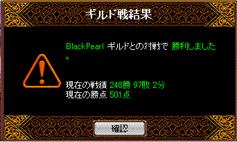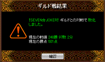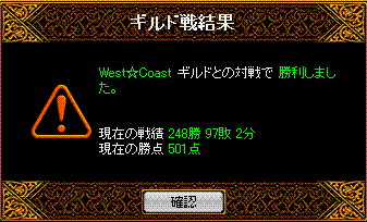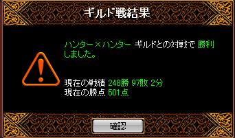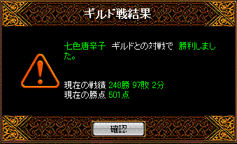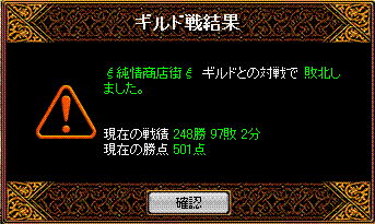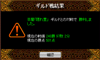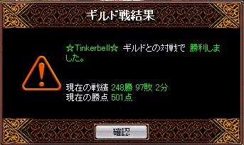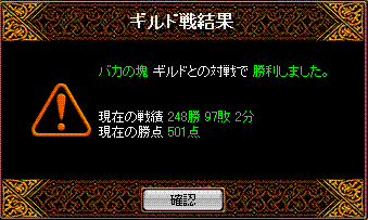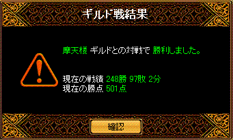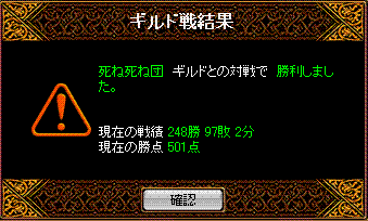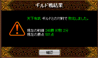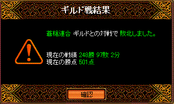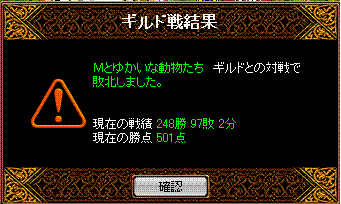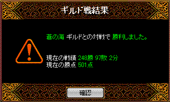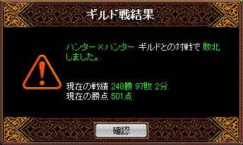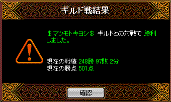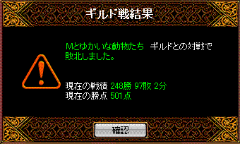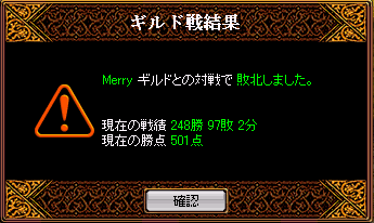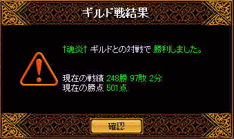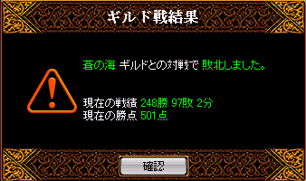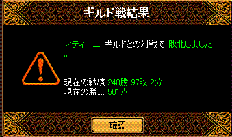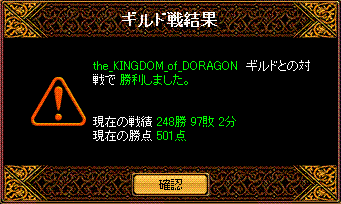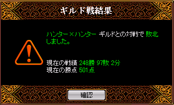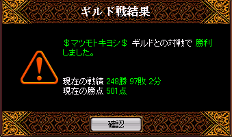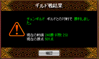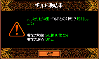 昨日のギルド戦は管理人が参加できなかったため時間・場所人数ともに不明ですので、結果のみ貼らせていただきます。結果本日23時より攻城戦ですので参加お待ちしております。