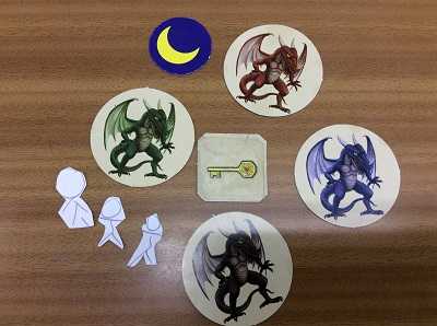 たとえば、ゲームに付属するドラゴンのカードや宝のカード、カギのカード、お日さまや月のカードだけでも、たとえば物語を考えるときなどに、具体的な支援となるのです。