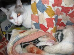 僕、健♂またまた虫が出ちゃいました。4回目も回虫が出たので、6日に病院で検査して貰って、まだ回虫の卵がいてる~と、先生に言われてたから~。5回目の虫下しを飲ませても、虫は出るだろうなぁ~と、思ってたんだけどねぇ~。出ちゃいましたよ~。┐(;ΘoΘ)┌ =3 ハァ…今回も虫は出るだろうなぁ~なんて思ってたお母さん。健ちゃん、横向いてるけど、聞いてるの~?虫が出ちゃったんだよ~。またまた出ちゃったんだよね。5回目も虫が出て、僕、こけちゃいました。虫下し飲む度に回虫が出るよねぇ~。こんだけ長引くのは初めてなんだけど・・・。虫下し飲ますと、今までなら、一気に虫が出ることが多かったんだけど・・・。健の場合は、1匹しか出ない~~。1回目は虫はなし!2回目は、飲んだ夜に1匹。翌日に1匹。3回目は、飲んだ夕方に1匹。4回目は、飲んだ翌日に1匹。5回目は、飲んだ夜に1匹。5回目から、虫下しも種類が違うのを貰ってきたので、6回目も違った虫下しを飲ますことになる~。健ちゃ~~ん、ホント早く虫がいなくなって、お母さんを少しでも楽にしてねぇ~。健も3ヶ月になったので、旦那と相談して、1日数時間でも皆と遊ばすことにしました。他の(=^-^=)達が、健のお尻を舐めないように気をつけるようにして、遊ばすことにしました。特に、まだ1年になってない、純とミコは要注意なので、純とミコが健と遊ぶ場合は、目を光らせることにしました。奥左からウンチッチ♂チャッチャ♀ヤンチャ♀手前はボク♂がコタツの中で。 左チビスケ♂とクロッチ♂、コタツの中で寝てる。デコ♀、カバーのところで横になってる。 寅♂、カバーのところで座ってる。20日(水曜日)の出来事!朝の冷え込みも少し和らいでたけど、最低気温はやっぱりマイナス0.6度でした。朝から曇り~~。外は寒くもなかったけど、暖かいなぁ~とも、思えない一日になりました。予報では3月下旬か4月上旬の気候になった~なんて言ってたけど、暖かく感じなかったです。夜になって、午後9時前から:::( ^^)T ::: 雨だぁ~。パラパラと降ってきたよ~。明日21日は、雨の一日になるのかなぁ~??