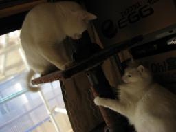 白対白、誰だか分かりますかぁ~?1誰と誰が対戦してるかな?(少し暗くて分かりずらいかな?でも、1匹は分かるよねぇ~) 上からシャー~手も出そう。上に登りた~~い。でも、登れな~~い。シャーは怖いよ~。お顔も怖いよ~。上から静観してる?それとも~?やっぱり下からだと、形勢は不利だよね。白対白、誰だか分かりますかぁ~?2 対戦前の静けさか?(こっちも1匹は分かるよねぇ~?)変な顔になってますよ~。コタツの上から見てるのはミコ♀。29日(金曜日)の出来事!今朝は、薄っすらと霜が降りてた~。やっぱり{{(T-T)}}ブルブル・・・さむっっい朝になりました。朝から晴れ~~。晴れてると暖かい~。窓ガラス越しの陽射しはポカポカと暖かかったです。(*^_^*)夕方から買物に行ってきた~~。ポンカン5キロ高知産があったので買っちゃいました。ヾ(@⌒¬⌒@)ノ ウマヒィ。それから晩ご飯用に、お弁当も買っちゃいました。 100円弁当。俵型おにぎり2個にコロッケ半分・から揚げ・焼きソバ・漬物が入って100円~~。冷凍きつねうどんにとろろ昆布入り。100円弁当だけだと少ないかなぁ~と思って、きつねうどんを作ったョ。(大きなきつねが入った冷凍のきつねうどんです。)今夜は、楽な晩ご飯でした。(*^_^*)