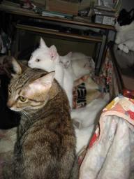 白猫でオッドアイー1サチ♀サチ、ケージの二段目で~~。 サチ、ケージの二段目で、顔が少し横向き。三毛猫-1ふく♀ふく、ケージの一番上で~~。ふく、ケージの一番上で、顔が少し横向き。白猫でオッドアイー2純♂純、もう一つのお母さんのPCの下で。 純、ボロボロの箱の中に入ってる。 三毛猫ー2ミコ♀ミコ、カーペットの上で横になってる。 ミコ、ケージの前で座ってる。白猫でオッドアイー3健♂ 健、座椅子のところで、ちょこんと座ってる。 健、遊び疲れて?休憩かな。 30日(土曜日)の出来事!やっぱり朝は{{(T-T)}}ブルブル・・・さむっっいです。日中は晴れて、暖かくなってきてるけど・・・。ガラス越しの陽射しは、ポカポカと暖かいです。(*^_^*)30日の白猫同士の対戦だぁ~白対白、誰だか分かりますかぁ~?1○○と純白対白、誰だか分かりますかぁ~?2○○と健答えは。。。2月1日にアップの予定です。(*^_^*)