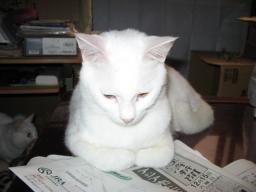 ホワイト♂、新聞を逆さにして真剣に読んでる?読んでるように見える~。少し暗くて分かりにくいけど、後のPCの所にいるのは「あい」♀。ホワイト、新聞を読んでた?けど、休憩中?かな。カメラ目線? してくれたのかな?後のPCの所にいるのは「あい」どこ見てるの~?ホワイト、またまた新聞に目を落としてる?ように見える~。後のPCの所で座ってるのは「あい」 ホワイト、少し遠くの方の記事を見てる?かな。それとも、新聞を押さえてるだけ~かな。少しピンボケになってる健♂(写すのが近すぎたみたい) 後ろ向きの健。アラシの写真の額に手を置いて、何してたの~?