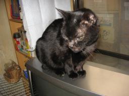 僕クロッチ♂です。07年2月に片目しか見えなくなったけど、"o( ̄‐ ̄*)ゲンキ!!だったんだけど・・・。3~4日前?から、調子が悪くなってて。。。9日に、お父さんの横でお尻を舐め舐めしてると・・・。お尻がタダレテル~~と、言われたよ~。(コタツの中に入ると、殆ど出てこないから、全然分からなかったんだけど・・・。)お母さんが獣医さんとこに電話して、夕方から連れて行かれた~。クロッチ、カバーの上で眠ってるのかな?TVの上にいてるクロッチ。 クロッチ、スチール棚で日向ぼっこしてる~。 クロッチ・チャッチャ♀兄妹(姉弟)コタツの中で。ウンチッチ♂・クロッチPCの下で寝てる。 獣医さんに診て貰ったら。。。肛門(お尻の穴)の周りにある『におい袋』が炎症を起こして、タダレテたようです。肛門嚢とはイタチとかスカンクが外敵に襲われたときに、おならをするということを知ってると思いますが。。。実は、犬や猫にもにおいのする、液状の分泌物が入った袋がお尻の穴の左右にひとつづつあるそうです。穴が開いていて、そこから中の分泌物が出てくるようになってるそうです。年を取ると、この穴が正常に働かずに塞がって、炎症を起こしたりするそうです。注射して貰って、飲み薬と塗り薬で治すように言われました。只、癖になって、治っても、度々なる場合も多いそうですが・・・。治るまで10日は、かかるでしょう~と、言われて帰ってきました。これから毎日、塗り薬は一日一回。飲み薬は毎日、一日二回飲まさないと~~。クロッチ、嫌なことされると、すんご~~い力が出るんだよね。旦那と二人かかりでやらないと、無理なんだよねぇ~。┐(;ΘoΘ)┌ =3 ハァ…毎日の薬の時間が大変になるなぁ~。 健♂僕もまだ、皆と遊べないんだぁ~。まだ、虫がいてるから、こうしてお母さん相手に遊んでるんだ。早くお薬飲んで皆と遊びたい~~。でもね、健ちゃん、お薬は2週間に1回だから、まだ、飲めないんだよねぇ~。 9日(土曜日)の出来事!今朝も{{(T-T)}}ブルブル・・・さむっっい朝になりました。日中は晴れて太陽も照って、暖かく感じたよ~。やっぱり風がなくて、太陽が照ってると暖かいよねぇ~。