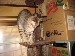 健♂は、暴れまくり~走りまくり~の毎日だから、とうとうお母さんに、タワーのBOXの中に放り込まれた~~。(2~3日前だったかな?)健、タワーBOXの中で、匂いを嗅いでる~かな?健、BOXの中で欠伸?雄たけび? 健、少しはヾ(_ _。)ハンセイ…したの~?と、思うような顔してないかい~~??健、(・・。)…ん?舌がでてるよ~。それとも仕舞い忘れなの~?健ちゃ~~ん、どこ見てるの~??健、身を乗り出して、下を見てる~ 。高さがあるからねぇ~。降りれないよ~。飛び降りると、怪我しちゃうからねぇ~。健はBOXの中から身を乗り出し過ぎ~~。落ちるのかなぁ~と、心配そう?に下から見てるのは、窓際のホワイト♂とBOX下の純♂。健はBOXの中を見てるのかな?純は健を見てる。ホワイトは窓から外を見てる。健、身を乗り出しすぎ~それを見てる純。ホワイトは純の方を見てたのかな? 健ちゃ~~ん、もうBOXは飽きたの~?出たいの~?(・・。)…ん?下にいる純とホワイトは、もう健を見てない~~。誰かが通ってたのかな?いつ来てたのか、一番上にタロウ♂がいてた~。左手前にあるTVから、タワーに飛び乗ったのかな?27日(水曜日)の出来事!今朝の冷え込みはきつかった。最低気温は、マイナス4.7度~~。{{(T-T)}}ブルブル・・・さむっっい朝でした。朝から晴れてたけど・・・。外は風が冷たく、太陽が当たってても、暖かいと感じなかったですよ~。