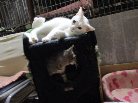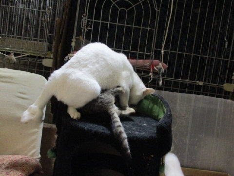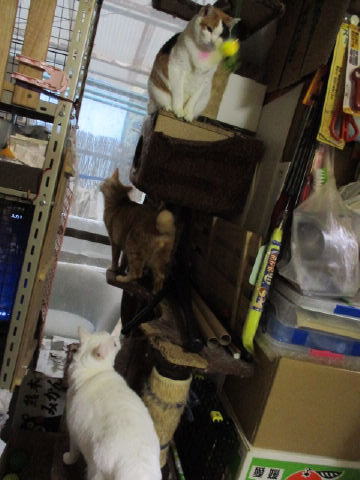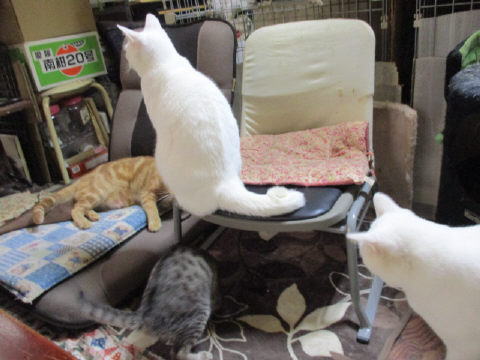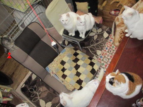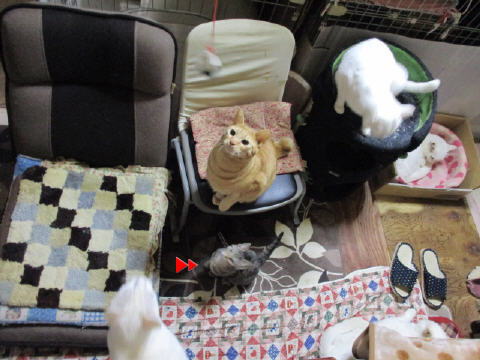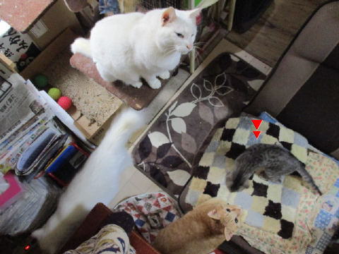 ちいちゃいユキ♀も、大きなお兄ちゃんお姉ちゃんに混じって、頑張って遊んでますよ~。ちいちぃ身体のユキ♀は、座椅子の上から、狙うのが一番かにゃ~。3日は~~最低気温3.2℃最高気温15.9℃朝から、晴れ~~。今日も、お日様が顔出ししてた日中は、暖かかったです。様子見(=^-^=)達は、あい♀ボク♂大♂きじ丸♂の4にゃんこ毎日の飲み薬はシリンジで、ボク♂きじ丸♂の2にゃんに飲ませてます。まだまだ手がかかってます。申し訳ないですが、暫くは、コメントへのお返事は無理みたいです。我が家の25にゃんこの紹介は2016年01月05日の日記←25匹の猫達の画像と短い紹介を書いてます。 左上の方にある『ホーム』をクリックして入ると、毎年のにゃんこの紹介も見れますョ。