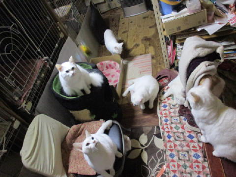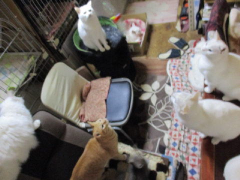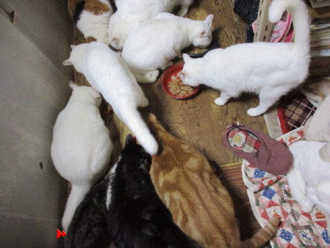 おやつだよ~で、みんにゃ集まってきたよ~。^^小さいユキ♀は、初めての経験です。大きなお兄ちゃんお姉ちゃんの隙間をかいくぐって食べてますよ~。(赤い⇒はユキ♀です)どうやらユキ♀は、ボク♂やミコ♀と同じように、最後まで食べてたみたいだにゃ~。^^白いにゃんこは、剛♂マリ♀が最後まで食べてたみたい。1日は~~最低気温6.6℃最高気温15.2℃朝から、どんよりした曇り空。薄暗い空模様だったよ~。今日も朝から、ファンヒーターとストーブに、電気カーペット点けてた~。なので、部屋の中は、ぬくぬくで~す。^^様子見(=^-^=)達は、あい♀ボク♂大♂きじ丸♂の4にゃんこ毎日の飲み薬はシリンジで、ボク♂きじ丸♂の2にゃんに飲ませてます。まだまだ手がかかってます。申し訳ないですが、暫くは、コメントへのお返事は無理みたいです。我が家の25にゃんこの紹介は2016年01月05日の日記←25匹の猫達の画像と短い紹介を書いてます。 左上の方にある『ホーム』をクリックして入ると、毎年のにゃんこの紹介も見れますョ。