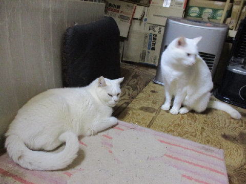 左は寅♂右は天♂は何を見てるの~?天♂が見てたのは、右から白菜咥えて出てきたユキ♀ 天♂に取られないように警戒?してるユキ♀天♂に取られないかにゃ~と思ってる?ユキ♀将♂の所まで持ってきたユキ♀は、白菜の切れ端をつついてる。ロンボーの上にコチャ♂奥は、我関せずの寅♂天♂は諦めたのか?台所の方?へ行こうとしてるのかな?(白菜は台所にあるので)23日は~~最低気温5.0℃最高気温12.3℃朝から小雨が降ったり止んだり。薄日が射してる~と思ってたら、小雨がパラつく変な空模様。夕方から、一段と寒くなってきた~。冷え込んできたよ~。寒いのは嫌いだなぁ~。様子見(=^-^=)達は、あい♀ボク♂大♂きじ丸♂の4にゃんこ毎日の飲み薬はシリンジで、ボク♂きじ丸♂の2にゃんに飲ませてます。まだまだ手がかかってます。申し訳ないですが、暫くは、コメントへのお返事は無理みたいです我が家の25にゃんこの紹介は2016年01月05日の日記←25匹の猫達の画像と短い紹介を書いてます。 左上の方にある『ホーム』をクリックして入ると、毎年のにゃんこの紹介も見れますョ。