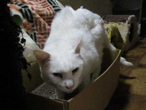チェアー下の爪とぎ箱で座るのかな?出るのかな?