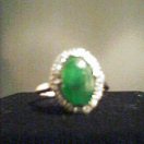 何でも願い事が叶うという「如意」と金運に良さそうな古代銭を大切そうに抱えてる黄色い翡翠のおサルさんです。画像では分かりにくいですがこのおサルさんの笑顔がとても可愛らしく、おサルさんを見つめてる自分も、つられてニッコリしちゃうほど本当に愛らしいお顔をしています。きっと、うれしいときは一緒に喜んでくれ悲しいことがあったとしても「大丈夫だよ♪」って励ましてくれそうな暖かい笑顔です。こちらは、おサルさんと一緒に到着した翡翠ルースです。ジョイテックさん発行の「楽技」という楽しい広報誌の1周年記念で抽選で60名に翡翠のルースプレゼントにめでたく当選して、いただいたルースです。朝露のようで、とっても綺麗な透明感のある翡翠です。ちょっと前に入手したお気に入りのペリドットリングです。(3月8日の日記に、ソックリなペリドットリングを載せてますが別の指輪です。昔から、指輪に限らず似たような、でも、微妙に違うっていうのばかり買っちゃいます。)バフトップカットでイエローゴールドの台です。若葉色で綺麗です。フクリン留め(爪がなくて、グルっと石をしっかり囲むようなセッティング)なのですが24時間着けっぱなしにしてたせいか緩んでしまいました(修理済み)。フクリン留めは、ぜったい緩まないって思い込んでいたのでちょっとビックリしましたが、勉強になりました。