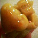 最近、ネットの1円オークションでお買い得に入手した翡翠のアンティーク(中古)な指輪です。およそ40年くらい前くらいの物だそうです。台はプラチナ、周りのダイヤもキラキラしてて、翡翠もとっても綺麗です。1万8千円で落札しました。私は、アンティークな雰囲気が好きでよく骨董フェアとかへ行くんですが、なんとなく前の持ち主のこととかが気になって、結局いっつも入手する機会がなかったのですが(家に置いてある家具も、ホントのアンティークじゃなくて、アンティーク風だし)今回の指輪、綺麗だなぁって思いつつ、ダメモト価格で遊び感覚で入札してたらご縁があったみたいで、すんなり落札できちゃいました。正直に言うと、実際にこの指輪を手にするまでは、デザインとか指輪そのものは気に入ってたのですごく嬉しい気持ちとともに、やっぱり前の持ち主のこととかが気になってました^^;でも、この指輪の実物を目にした瞬間、とっても可愛くて綺麗に見えこのコはウチのコ♪って、素直に気に入ることができました♪初骨董です。受け売りですがあるHPで、書いてた言葉が縁起物好きの自分にとって、心に残ってます「ジュエリーが長い年月、大切に引き継がれてきて、壊れずに残っている運の強さも、そのお品から譲り受けれるように思う」という内容です。アンティークって、こういうステキな考え方も出来るのですね♪手元に来てくれた指輪、大切にしようと思います。最近入手した水晶の布袋さま。笑顔がうちのお爺ちゃんにソックリだったので、なんとなく購入しましたこれは、中華系のパワーストーンのお店で購入した玉のヒキュウです。ヒキュウは、風水とかに出てくる動物で、とっても優しい動物で、ギャンブル運とかを高めてくれるようです。いつもは子供が喜んで着けてるのですが、ふだん興味の無い夫までほしがってる、我が家で人気者のヒキュウちゃんです。