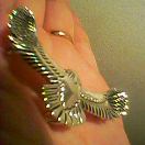 普段の私は、どちらかというと女らしいデザインのリングが好きなのですが周期的に、こういうハードっぽいカッコイイシルバーリングが欲しくなります。今もそのシルバーが欲しい時期で、昨日、ちょうど出先でこの指輪を見つけたので夫に買ってもらいました♪シルバーリングをいっぱい乗せたワゴンで売られてました♪この指輪、自分が大好きな四葉のクローバーっぽいと思って選びました。そして、今日は、本屋へ行って、シルバーリングがいっぱい載ってる本を買ったので、あとで読もうと思います。シルバーを愛する人の熱いトークとかを読むのが大好きなのです。ちなみに今欲しいなぁって思ってるのは、ゴローさんという人が作るイーグル(鷲)のが欲しいです。前のマイシルバーブームのときも、欲しかったんだよなぁ、たしか。。。でも、私にとっては、結構高いので買えないまま、またまた私の中のシルバーブームが去っちゃってるかも。。。。^^;シルバーラブ♪