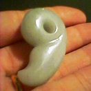 先日の日記で、抱っこ勾玉に夢中でうっかりと書きわすれていたのですが、このお馬さんも、かわせみどんの夏休みクイズと同時開催されていたクイズの応募者数当てクイズに当選して抱っこ勾玉と一緒に我が家に来てくれたお馬さんです。元気いっぱいなお馬さんで、とってもかわいいです。薄く紫がかった白の綺麗な翡翠に彫刻されています。以前、京都の貴船へ行ったときその近辺で子供が「ハートの石や♪」って見つけた石です。貴船へは初めて行ったのですがとても清められた感じがしました。清々しいステキな所でした。欠けてなかったときの姿 ずっと前の翡翠のクシ割り事件に懲りず、またまた、やってしまいました。。。^^;帰ってきてから、洗面所で外した際に手が滑って洗面台に落として、欠けてしまいました。でも、とても気に入ってるのでこのギザギザになった方向に紐の結び目がくるようにして、ギザギザを隠しこれからも着けようと思います。翡翠のクシのほうも、完全復活にはならなかったものの持ち手つきクシ風に復活させ、ときどき髪を梳いたりして遊びに使ってます。龍が勾玉に抱きついているデザインが気に入って買ったものです。ジョイさんの「勾玉の新世界シリーズ」です。この勾玉も貴船に着けていきました。神秘的な貴船の雰囲気にピッタリでした。楽天外の翡翠のお店で買いました。若竹色の、頭部分に三本の線が入っている、とても可愛い勾玉です。 最近、ジョイさんで見つけた神獣ちゃんです。古代銭の上に乗っています。半透明の濃いグリーンで、まるでロウカンのように綺麗な翡翠に愛らしいフェレットみたいな神獣が彫刻されてます。しょっちゅう身に着けています♪ほかには、ここ最近は、ヒキュウを集めたりインカローズを集めたりしてましたが、またの機会に日記に書けたら・・・と思います♪