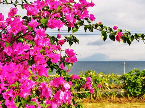 市の人が「これは指宿市の花だ」と言うブーゲンビリア(本当はハイビスカスと菜の花)。とても美しい。遠景は桜島である。九州、すごか!This is Bougainvillea which people in the city say it is Ibusuki-City's Flower (the truth is Hibiscus and Rape-Blossom). How beautiful it is. The background is Sakurajima. Kyushu, the Great!